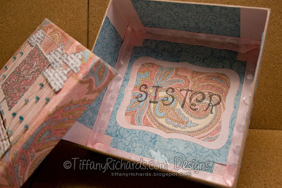 I made this box for my sister Laura! I got the idea from my #1, all time favorite crafting IDOL, Mel McCarthy at Mel Stampz. She made a beautiful box with the Riley Tree Stamp (from Paper Garden Projects). Here is Melz project, which is beyond beautiful! (like everything she does!)